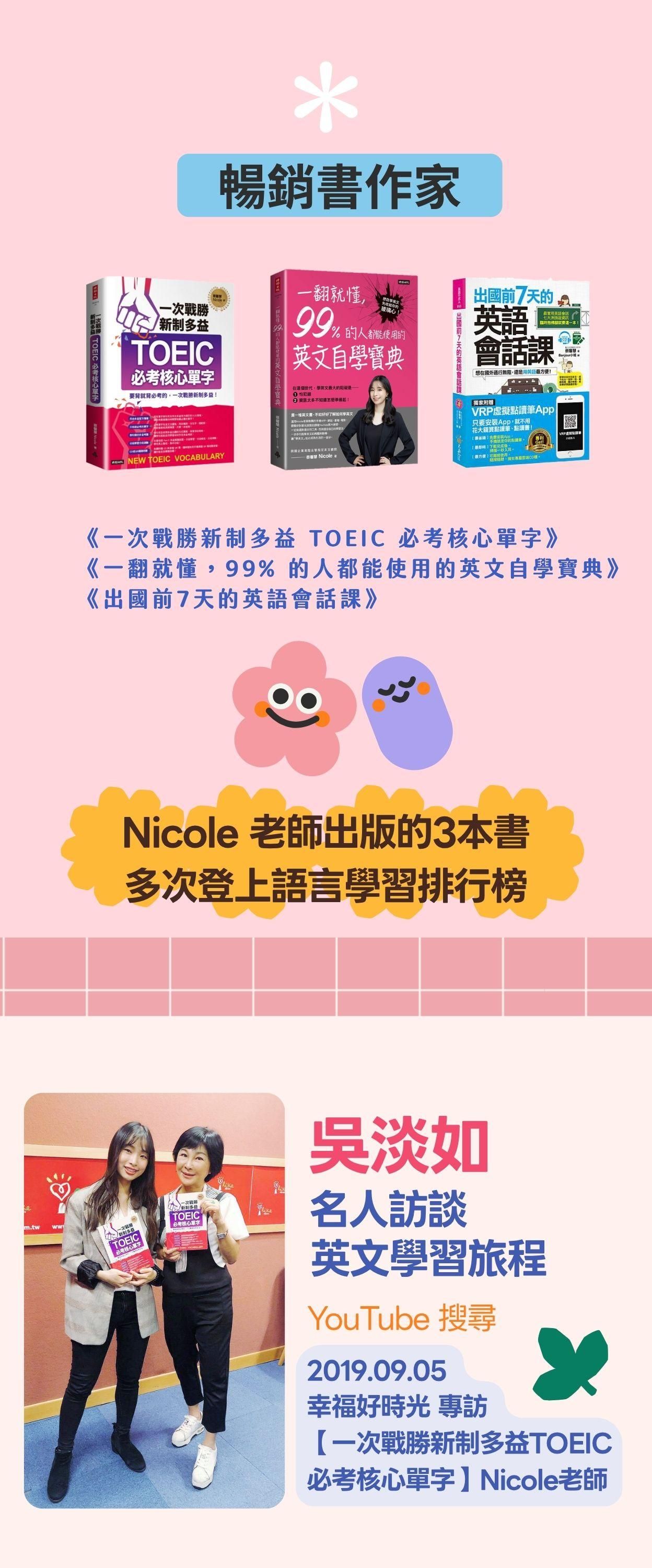 ・著有《一次戰勝新制多益 TOEIC 必考核心單字》、《一翻就懂,99% 的人都能使用的英文自學寶典》(時報出版)、《出國前7天的英語會話課》(不求人文化)